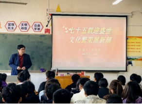 授课中,陈松涛首先以中国共产党第二十届中央委员会第三次全体会议公报中“必须增强文化自信”为引,激发同学们对文化发展的思考。随后又以时间为脉络,分别从“核心价值观固本培元”“文化繁荣滋润人心”“文脉传承历久弥新”“中华文化影响力持续扩大”四个方面具体讲述,从政策制定到落地实施,从经典古籍的数字化传承到现代文化产业的创新崛起,陈松涛带领全体师生们深切领略到当代文化的繁荣昌盛。最后,他又以“实现中国梦是一场历史接力赛,当代青年要在实现民族复兴的赛道上奋勇争先”结尾,鼓励广大青年以文化己、以文化人,为文化强国建设厚植信念之基。
