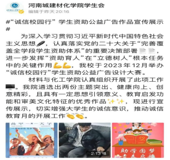 申博sunbet认真组织并开展了此项工作,遴选出两份主题突出、健康向上、创意精彩,且具有一定思想引领意义、教育启发功能和审美文化特征的平面类优秀作品,通过微信公众号、QQ空间、板报宣传等两线结合的方式对优秀作品进行宣传展示。这些作品不仅体现了员工对诚信的深刻理解和积极态度,展现出他们的创新精神和社会责任感,更充分彰显了公司资助育人的工作成效,在广大师生中引起积极反响。
