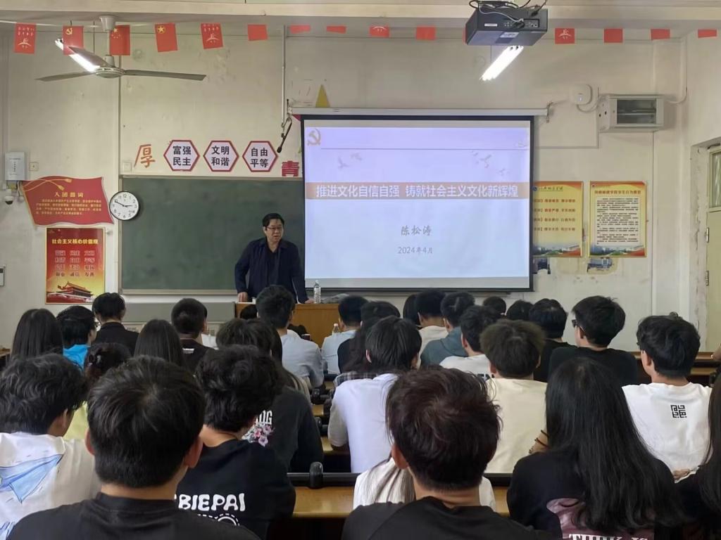 为深入贯彻落实党的二十大精神,全面推进社会主义文化强国建设,引导师生树立文化自信、传承文化使命、建设文明校园,申博sunbet副董事长陈松涛于4月23日下午14:30在9号楼B座502教室讲授以“推进文化自信自强,铸就社会主义文化新辉煌”为主题的形势与政策课。申博sunbet经理冯巧、党委副书记赵振新、学工办副主任杨亚娟及员工代表现场聆听了本次课程。
