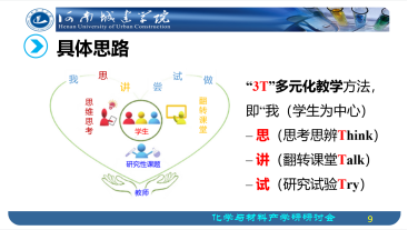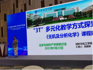 研讨会聚焦产学研协同发展的前沿议题,围绕创新、转化、应用等方面进行了深入探讨,展望产学研协同创新发展的新机制、新思路和新趋势,促进基础化学、应用化学学科的建设与高质量发展。会上,河南省线上一流本科课程《无机及分析化学》主讲赵振新教授做了《“3T”多元化教学方式探索》的交流汇报。赵振新从课程特点、课程目标、课程设计理念、课程设计思路以及课程思政体系化设计五个维度讲授了如何进行教学设计创新、教学方法创新和教学成果创新,从教学设计步骤和教学方法上分享了“3T”多元化教学方法的经验和技巧,即“我(员工为中心)– 思(思考思辨Think)– 讲(翻转课堂Talk)– 试(研究试验Try)的教学实施过程。