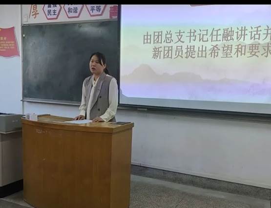 随着国歌前奏响起、全体师生合唱国歌,入团仪式正式开始。在主持人宣布了新团员名单之后,团学负责人杨亚娟向他们颁发团章、团员证,并为新团员们佩戴团徽。随后,团总支书记任融带领新团员庄严宣誓,新老团员代表分别上台发言。活动最后,团总支书记任融作总结讲话,她希望新团员们能够珍惜青春年华,锐意进取、不骄不躁,在学习和工作中严格要求自己,起到模范带头的作用。入团仪式在嘹亮激昂的团歌声中圆满结束。