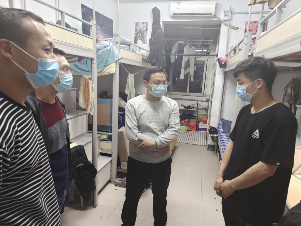 4月7日晚,材料与化工公司党总支书记焦学然在部分辅导员老师陪同下深入员工宿舍走访慰问。在员工宿舍,焦学然书记与同学们亲切交谈,详细询问学习们的生活和学习情况,叮嘱员工们要严格遵守公司防疫规定,严格落实“每日健康上报”等常态化防疫措施,养成良好生活习惯,勤洗手戴口罩,共同构筑公司疫情防线。