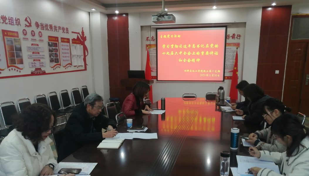 (通讯员李银峰)11月30日下午5点,材化公司教工第一党支部在材化公司会议室召开了“学习党的十九届六中全会精神”主题党日活动,会议由党支部书记胡继勇同志主持,副董事长杨风岭和全体党员参加。