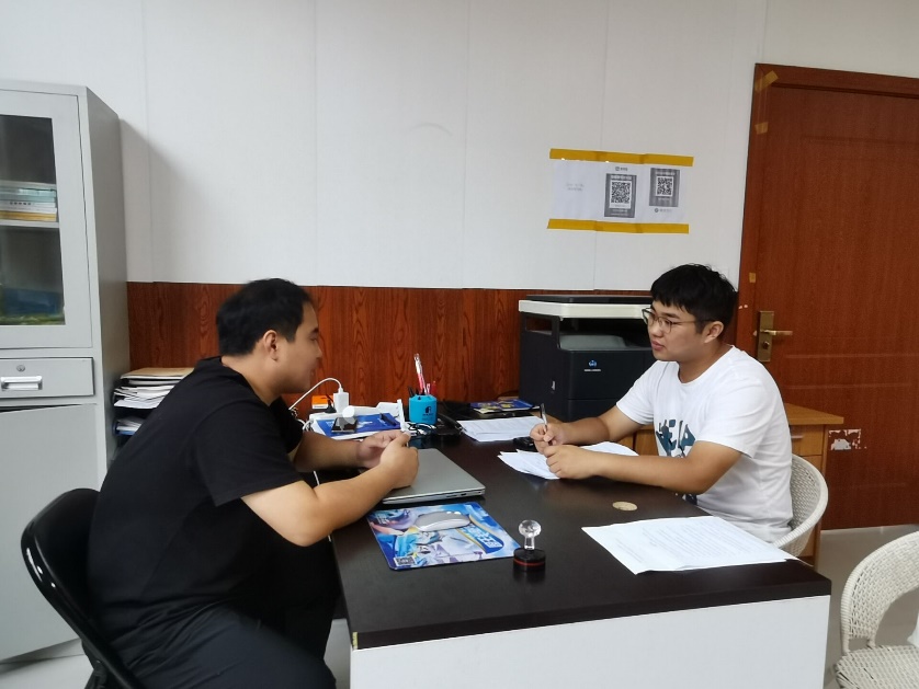 尹坤鹏为公司2017届毕业生,化学工程与工艺专业,毕业后经过自己的不懈努力,在平顶山市创办了海思考研公司,不断打拼,建立了海思考研基地。采访过程中,尹坤鹏学长讲述了自己的创业事迹。他和同事们在工作岗位上的努力与坚守,让同学们肃然起敬、深受启发。当回忆起笑声与汗水交织的老员工活时,他流露出对母校的思念与感激。采访结束,尹坤鹏邀请通讯员参观了海思考研基地,让同学们真正深入的体验公司各项工作运转的情况。