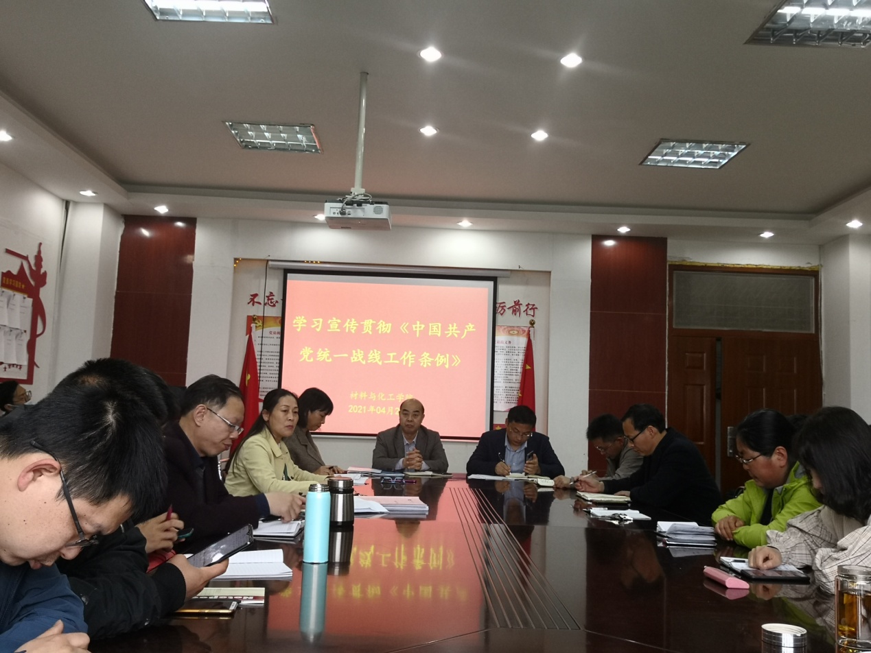 (通讯员 薛明三) 为提高统战意识,学习宣传《中国共产党统一战线工作条例》,全面准确学习领会党的统一战线方针政策,4月20日下午,材化公司党委在公司会议室召开教工大会,学习贯彻《中国共产党统一战线工作条例》。会议由材化公司党委书记焦学然主持。
