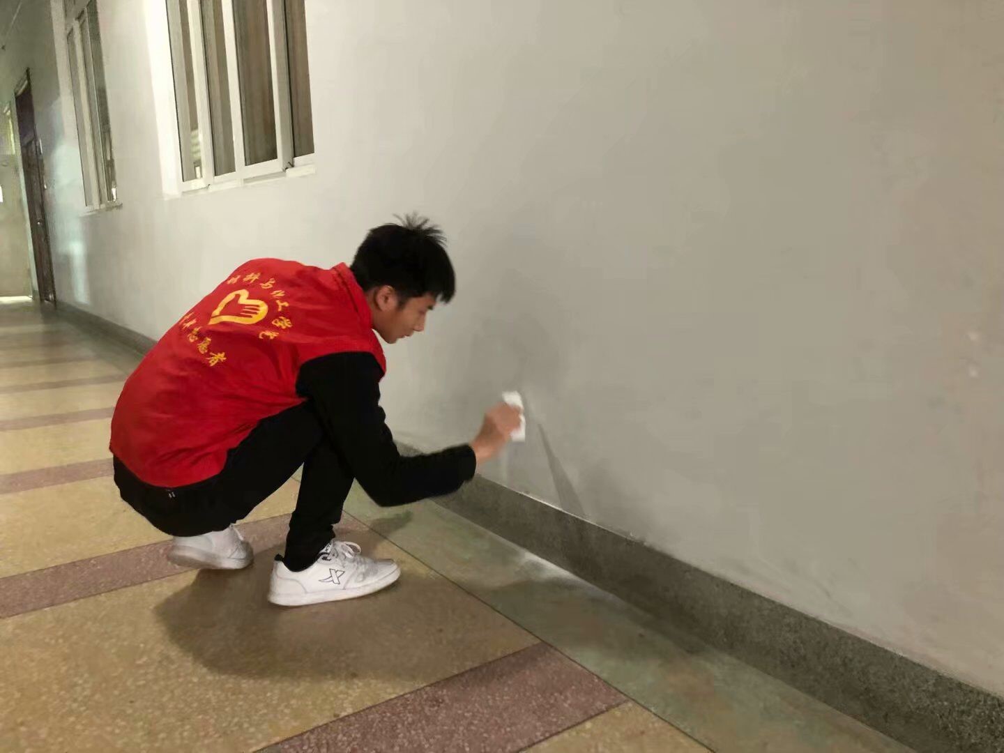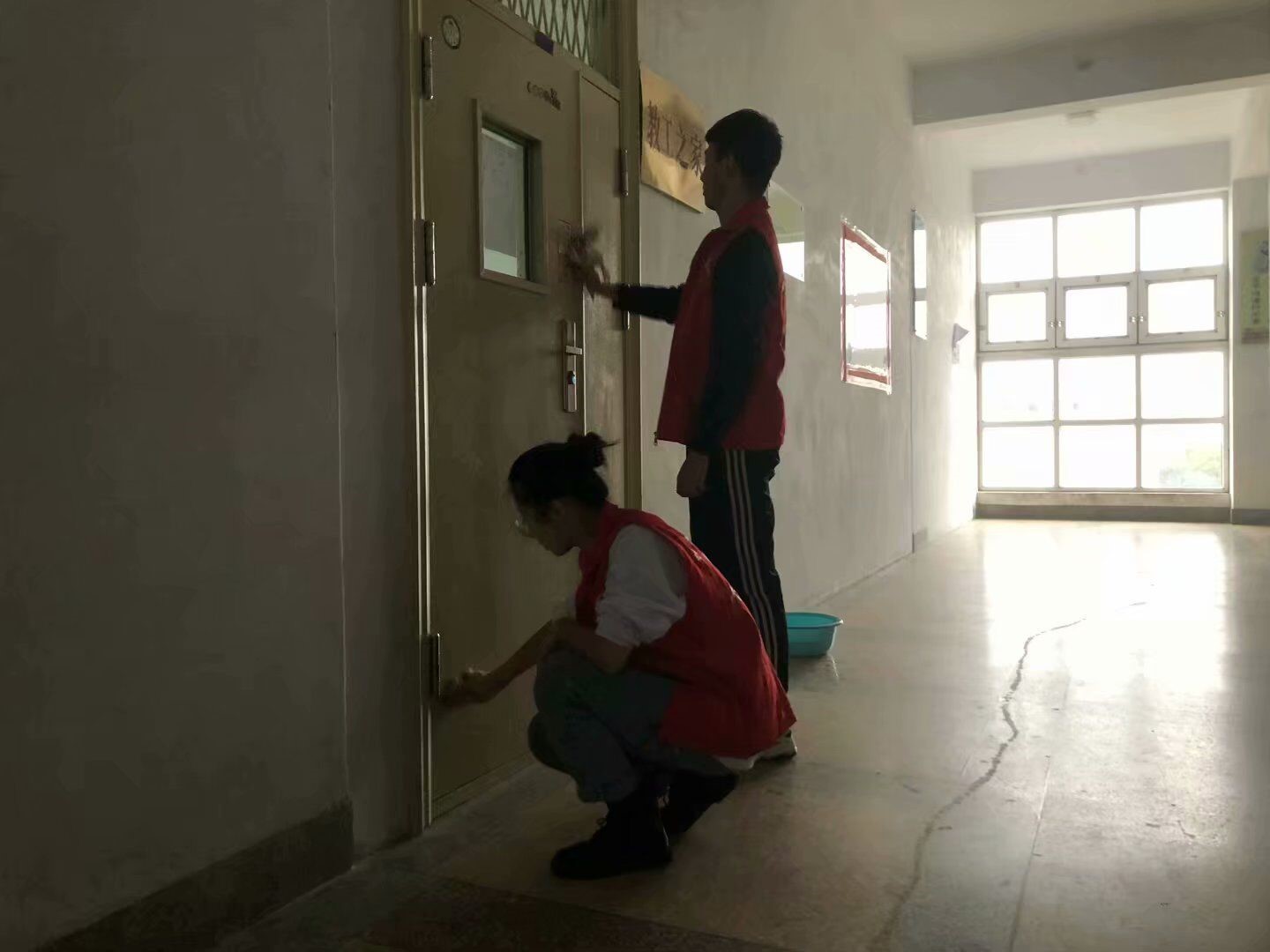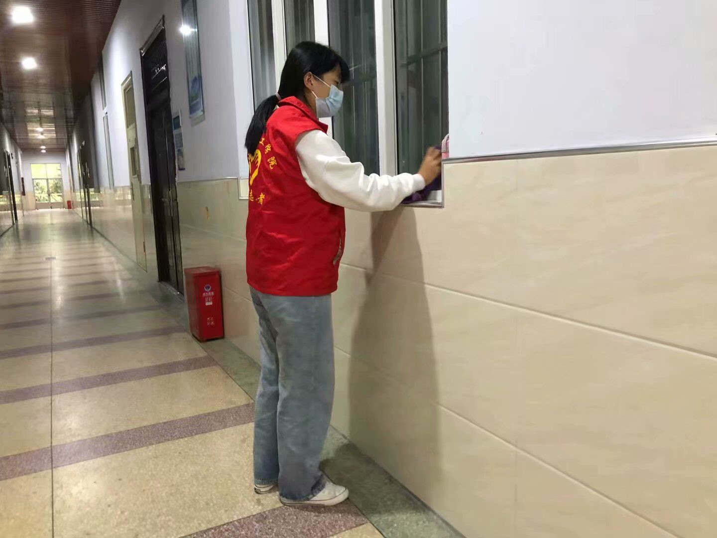 中午1点,志愿者们在一楼大厅集合。接着,志愿者们在队长的带领下分成两队,在九号楼的楼道内和教室的门窗进行了清洁。通过志愿者们的细心认真的清扫,让整个教学楼的面貌得到了较大的改善,志愿者们用实际行动展现了他们热爱劳动的志愿者服务精神,给师生们一个良好的教学环境。