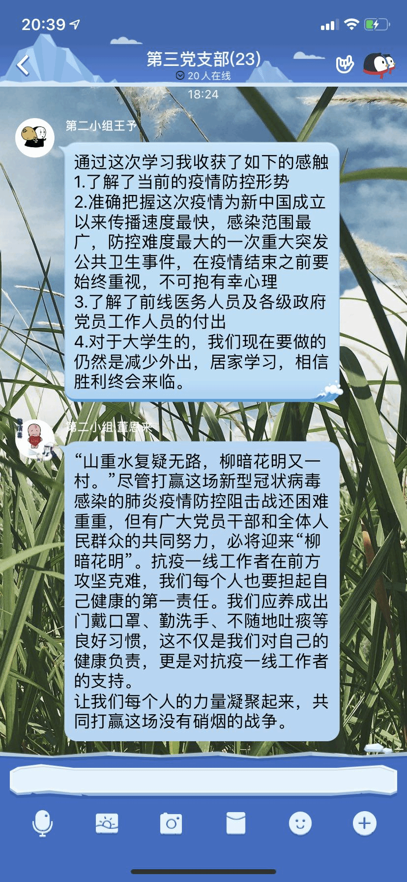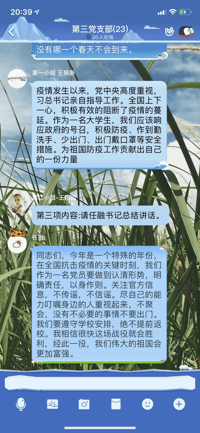 党支部书记任融同志做最后总结,她强调:今年是一个特殊的年份,在全国抗击疫情的关键时刻,我们作为一名党员要做到认清形势,明确责任,以身作则。关注官方信息,不传谣,不信谣。尽自己的能力叮嘱身边的人重视起来,不聚会,没有不必要的事情不要出门。要遵守公司安排,绝不提前返校。相信很快这场战役就会胜利,经此一役,我们伟大的祖国会更加富强。