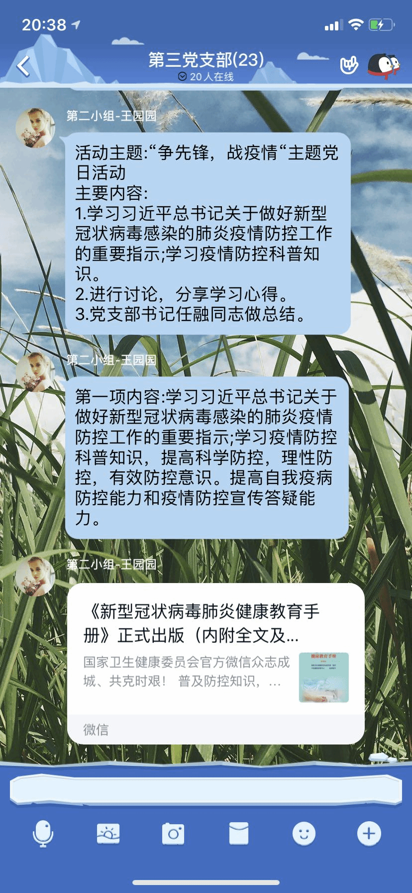 活动中,大家学习了习近平总书记关于做好新型冠状病毒感染的肺炎疫情防控工作的重要指示、疫情防控科普知识,并进行讨论,分享学习心得。