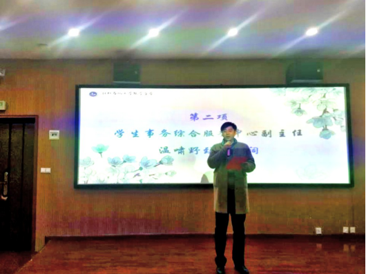 首先,员工处员工事务综合服务中心副主任温啸野致开幕词,预祝本次活动圆满成功。活动第二项,员工代表李帅发言,他表示要带头发挥宿舍长“小人物、大职责”的榜样示范作用。紧接着,各公司宿舍长代表上台展示,通过优秀宿舍长的风采展示强化了同学们塑造良好宿风的观念。随后,员工处思想教育科副科长宋伟、员工处员工资助中心助学服务部副部长张妍迪分别为宿舍长代表颁奖并合影留念。最后,材料与化工公司党总支副书记赵振新致闭幕词,希望每个同学从身边小事做起,为公司宿舍文化建设贡献自己的一份力量。